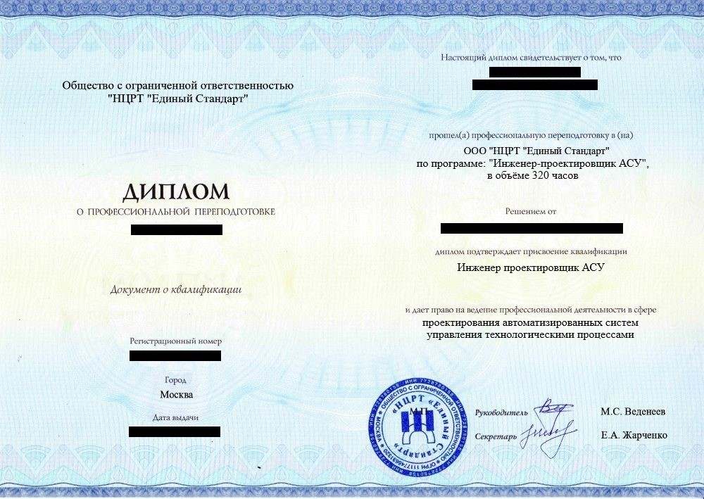 • «Инженер проектировщик АСУ» с правом ведения профессиональной деятельности в сфере проектирования автоматизированных систем управления технологическими процессами